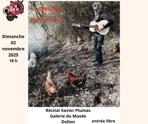 de 14:30 à 18:00 Bonne nouvelle pour les vacances de la Toussaint ! Le musée sera ouvert du mercredi au dimanche pour vous accueillir en famille ou entre amis. Horaires et tarifs habituels. Profitez de l’automne pour (re)découvrir nos collections dans une ambiance chaleureuse. Ateliers jeunes publics (à partir de 5 ans et accompagné d’un adulte) chaque jour à 16 h (en fonction des disponibilités). concert Xavier PUMAS