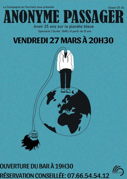 de 20:30 à 22:00 Avoir 20 ans sur la planète bleueLa compagnie Au tournant nous présente son spectacle Anonyme passager, avec Maxime Pichon et Sabine Balasse au violoncelle. Le texte, ironique et mordant, met en perspective des banalités du quotidien. Il interroge la jeunesse sur ce qu’est une vie, un projet, un échec. Le spectacle est écrit sous forme de morceaux, de fragments amovibles. Cette forme permet d’ancrer l’écriture dans le monde actuel. Le violoncelle, quant à lui, amène un peu de douceur et de ponctuation entre les diatribes et les vers (et les verres). Les compositions musicales viennent compléter les propos du personnage et invitent à des moments de contemplation. Entrée libre, au chapeau | 28 | 29 |